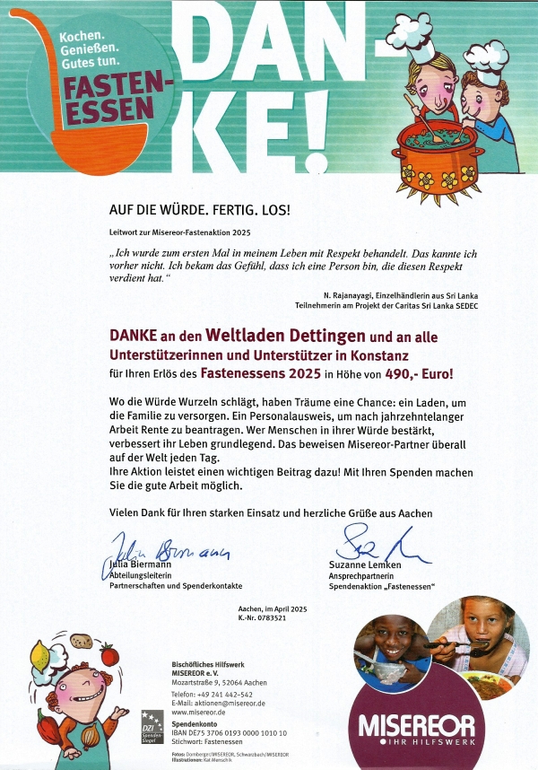 Als Erlös konnten wir 490 € an Misereor weiterleiten. Wir bedanken uns bei allen Gästen, dem fair.nah.logisch.-Team des Dekanats sowie allen Helferinnen und Helfern. Am 5. April wurde der gemeinsame Gottesdienst zum Misereor-Motto „Auf die Würde, fertig, los.“ auch in der Dreifaltigkeitskirche in Konstanz gefeiert.